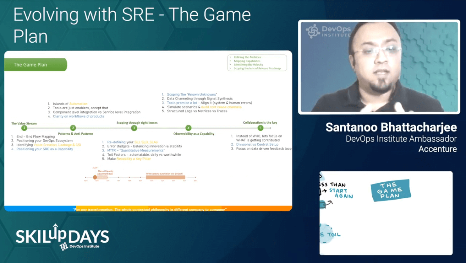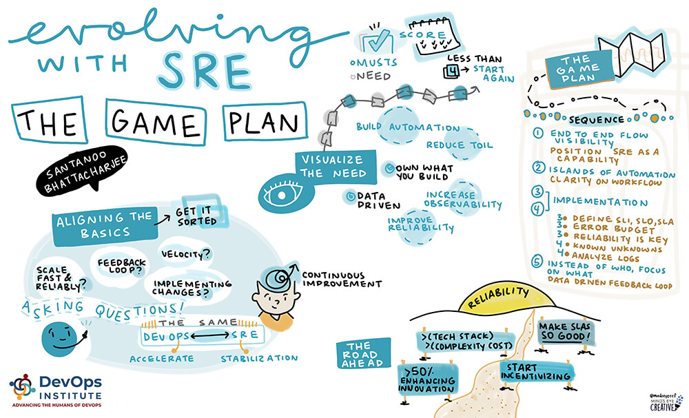 DevOps Institute Ambassador Santanoo Bhattacharjee presented the session, “Evolving with SRE – The Game Plan.” During his session, he noted that “while any transformation is driven by innovation, the end objective always remains reliability.” He also stressed that, “the core denominator of any growth equation is always discovering the elements of sustaining resiliency and reliability.” He proposed that a key question should always be clear, “We train & prepare ourselves for years just to be ready to fight something which has the power to lead to chaos in minutes.” The key lies in, “how much ready will we ever be!” He concluded with these parting words: “Do not emulate Google, they have a completely different structural case of having SRE in the first place. You will need to build reliability engineering constructs to refine your needs!”