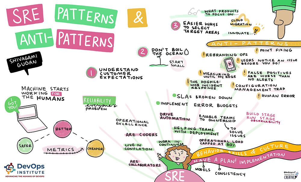 She shared many more anti-patterns such as point fixing, rebranding Ops, and the configuration management trap. She gave tangible advice for those looking to overcome common pitfalls along the path toward a successful SRE program including:
