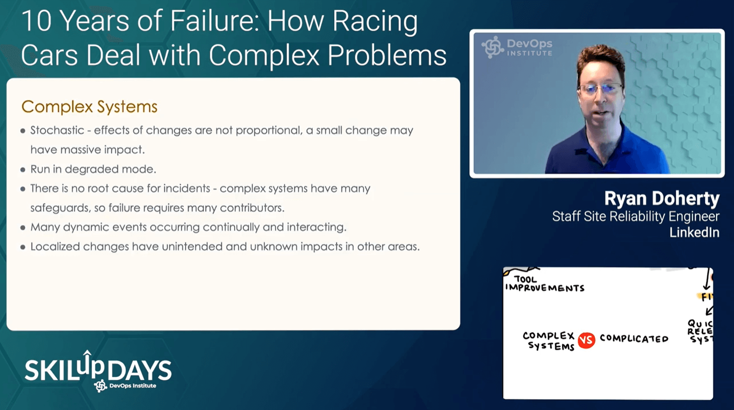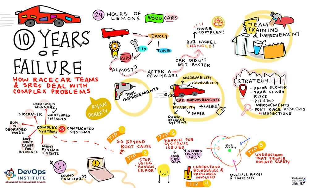 Keynote speaker Ryan Doherty, Staff SRE at LinkedIn, kicked off the sessions for the day. He shared unique insights during his session, “10 Years of Failure: How Racing Cars and SRE Deal With Complex Problems.” The session featured insights from Doherty on what building a race car and winning races have in common when building information systems: “The systems we build today are no longer complicated, they are *complex*…” He also noted that “it takes a completely new paradigm for how we plan, build, and maintain these systems.”