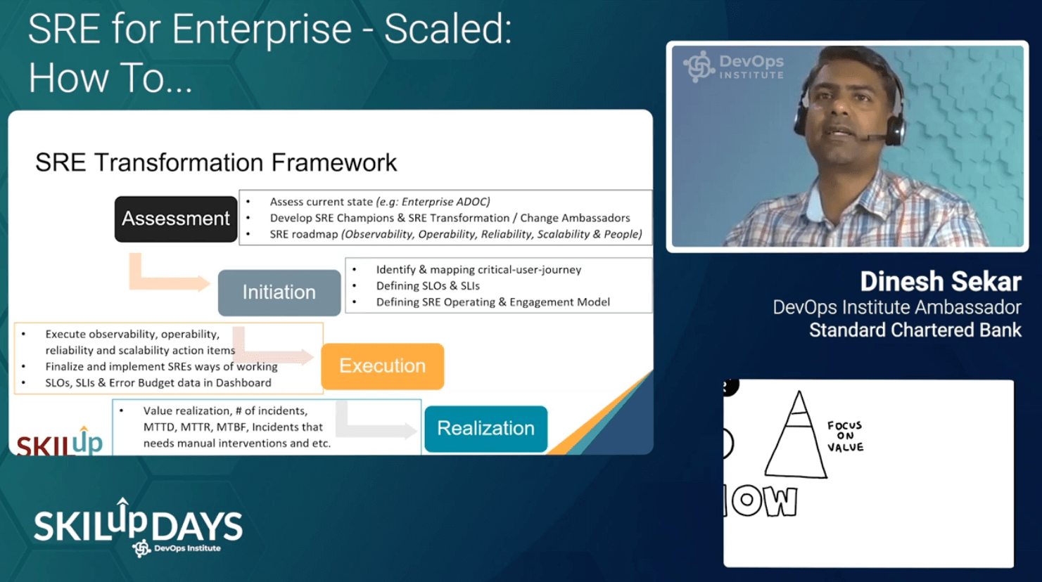 DevOps Institute Ambassador, Dinesh Sekar, returned for his second SRE SKILup Day with his session, “SRE Adoption for Enterprise – How to.” Sekar stressed that many organizations are not Google. He then went on to discuss how to adopt SRE at an enterprise-scaled organization. He gave tangible advice to those looking to overcome common challenges during an SRE transformation.