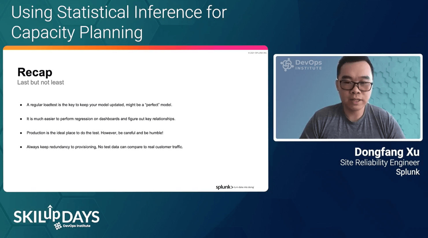 Many speakers had specific insights into how to better prepare your SRE teams. During his session, “Using Statistical Inference for Capacity Planning,” Dongfang Xu of Splunk explored how to do smarter capacity planning using the linear regression functionality available in Splunk Infrastructure Monitoring. According to Xu, capacity planning helps to avoid possible stability and reliability issues, elevates performance by identifying bottlenecks, is a better cost model, and supports the service-level agreement (SLA) that you want to achieve.