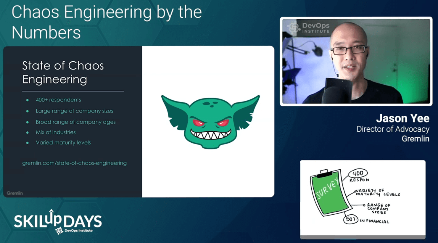 Jason Yee of Gremlin also took on Chaos Engineering during SRE SKILup Day. He shared important findings from the first State of Chaos Engineering Report during his session, “Chaos Engineering by the numbers.” The first State of Chaos Engineering report is a survey of hundreds of organizations about how they’re practicing Chaos Engineering and the results they’re seeing. With concrete data from the report, Yee shared a few outcomes teams can expect from implementing Chaos Engineering: