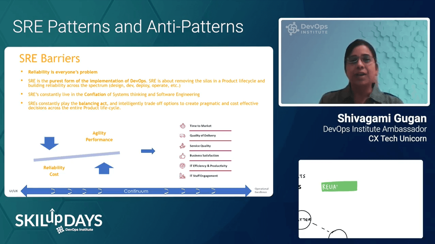 Shivagami Gugan, DevOps Institute Ambassador and Technologist and Aviation Specialist presented the session, “SRE Patterns and Anti-patterns.” During her session, she noted that “at any maturity level, there is always room for improvement at an organization for better business outcomes.” To concur with one of Ryan Doherty’s tips, Shivagami shared one of her favorite quotes from Jennifer Petoff, Director, Site Reliability Engineering Education at Google, when discussing SRE anti-patterns, “It’s never a human error, it’s a system problem.”