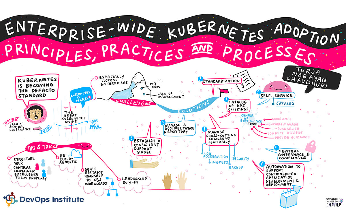 DevOps Institute Ambassador, Turja Narayan Chaudhuri of EY, shared key insights during his session “Enterprise-Wide Kubernetes Adoption – Principles, Practices and Processes.” Chaudhuri explored a few common patterns, architectures and practices that help drive adoption across the enterprise. He also explained the challenges involved with an enterprise-wide adoption of Kubernetes and how they can be handled by setting up an enterprise-ready application deployment platform/center of excellence that can help in the rapid adoption of Kubernetes across the enterprise. He then indicated the key drivers to increase adoption and discussed some potential roadmaps to driving the adoption journey for cloud-native in general and Kubernetes in particular across the enterprise.